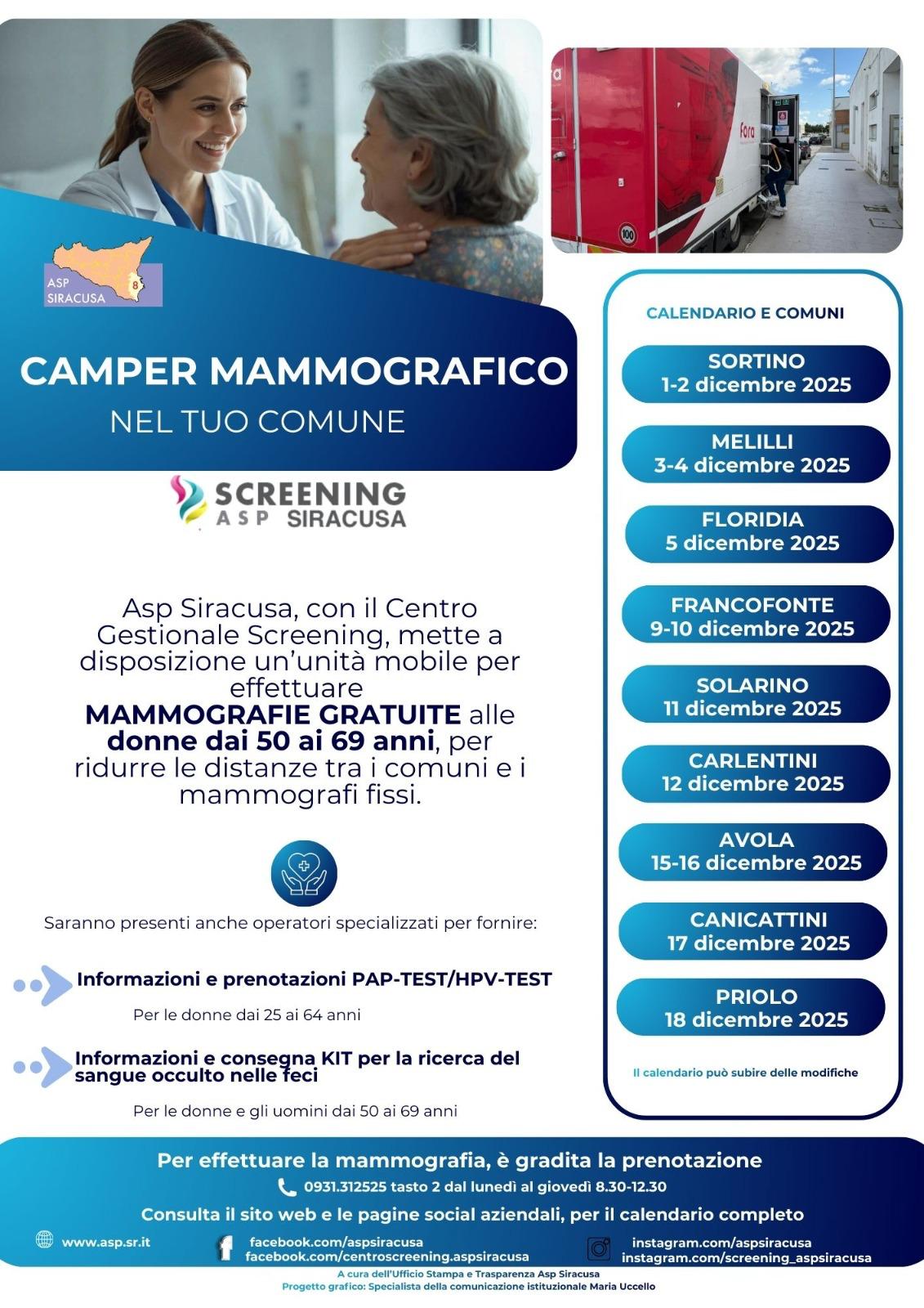 Nell'ambito del programma di potenziamento degli screening oncologici promosso dall'ASP di Siracusa con il Centro Gestionale Screening, si avvierà nei prossimi giorni l'attività del camper mammografico attrezzato, che farà tappa nel Comune di Carlentini nei giorni: 12 Dicembre 2025.